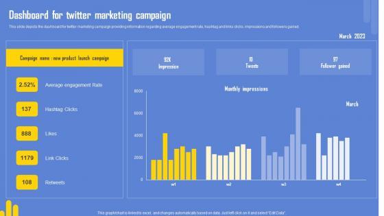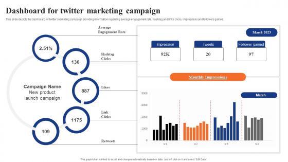 This slide depicts the dashboard for twitter marketing campaign providing information regarding average engagement rate, hashtag and links clicks, impressions and followers gained. From laying roadmaps to briefing everything in detail, our templates are perfect for you. You can set the stage with your presentation slides. All you have to do is download these easy-to-edit and customizable templates. Dashboard For Twitter Marketing Campaign Twitter Promotional Techniques Formats Pdf will help you deliver an outstanding performance that everyone would remember and praise you for. Do download this presentation today. This slide depicts the dashboard for twitter marketing campaign providing information regarding average engagement rate, hashtag and links clicks, impressions and followers gained.