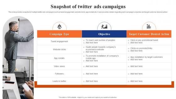 This slide provides snapshot of multiple twitter ads campaigns such as tweet engagement, website clicks, app installs etc. It also provides details regarding each campaigns objective and target customer desired action. Present like a pro with Utilizing Twitter For Social Media Snapshot Of Twitter Ads Campaigns Diagrams PDF Create beautiful presentations together with your team, using our easy-to-use presentation slides. Share your ideas in real-time and make changes on the fly by downloading our templates. So whether you are in the office, on the go, or in a remote location, you can stay in sync with your team and present your ideas with confidence. With Slidegeeks presentation got a whole lot easier. Grab these presentations today.