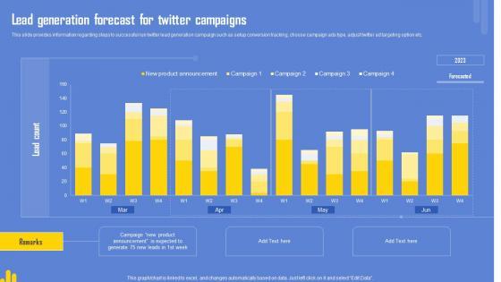 This slide provides information regarding steps to successful run twitter lead generation campaign such as setup conversion tracking, choose campaign ads type, adjust twitter ad targeting option etc. If your project calls for a presentation, then Slidegeeks is your go-to partner because we have professionally designed, easy-to-edit templates that are perfect for any presentation. After downloading, you can easily edit Lead Generation Forecast For Twitter Campaigns Twitter Promotional Techniques Template Pdf and make the changes accordingly. You can rearrange slides or fill them with different images. Check out all the handy templates This slide provides information regarding steps to successful run twitter lead generation campaign such as setup conversion tracking, choose campaign ads type, adjust twitter ad targeting option etc.