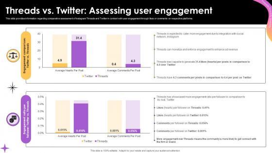 This slide provides information regarding comparative assessment of Instagram Threads and Twitter in context with user engagement through likes or comments on respective platforms. This modern and well-arranged Threads Vs Twitter Assessing User Engagement Everything To Know About Instagram Threads AI SS V provides lots of creative possibilities. It is very simple to customize and edit with the Powerpoint Software. Just drag and drop your pictures into the shapes. All facets of this template can be edited with Powerpoint, no extra software is necessary. Add your own material, put your images in the places assigned for them, adjust the colors, and then you can show your slides to the world, with an animated slide included. This slide provides information regarding comparative assessment of Instagram Threads and Twitter in context with user engagement through likes or comments on respective platforms.