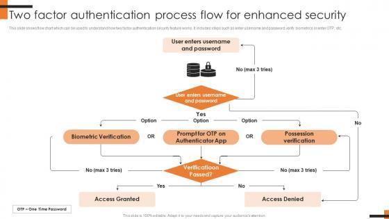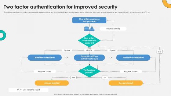 This slide shows flow chart which can be used to understand how two factor authentication security feature works. It includes steps such as enter username and password, verify biometrics or enter OTP, etc. Do you have an important presentation coming up Are you looking for something that will make your presentation stand out from the rest Look no further than Complete Beginners Guide Two Factor Authentication For Improved Security Fin SS V. With our professional designs, you can trust that your presentation will pop and make delivering it a smooth process. And with Slidegeeks, you can trust that your presentation will be unique and memorable. So why wait Grab Complete Beginners Guide Two Factor Authentication For Improved Security Fin SS V today and make your presentation stand out from the rest This slide shows flow chart which can be used to understand how two factor authentication security feature works. It includes steps such as enter username and password, verify biometrics or enter OTP, etc.