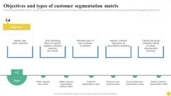 The following slide highlights a matrix to measure current and potential value if customers for refining business customers marketing and retention strategy. It showcases segments such as disengaged, star, light and new. There are so many reasons you need a Objectives And Types Of Customer Segmentation Matrix User Segmentation Themes Pdf. The first reason is you can not spend time making everything from scratch, Thus, Slidegeeks has made presentation templates for you too. You can easily download these templates from our website easily. The following slide highlights a matrix to measure current and potential value if customers for refining business customers marketing and retention strategy. It showcases segments such as disengaged, star, light and new.