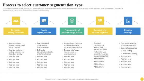 This slide showcases key steps to select the type of segmentation for creating effective marketing strategy. It presents steps such as recognize existing customers, create buyers persona, formulate list of potential target market, research selected segments and examine strategy. Here you can discover an assortment of the finest PowerPoint and Google Slides templates. With these templates, you can create presentations for a variety of purposes while simultaneously providing your audience with an eye catching visual experience. Download Process To Select Customer Segmentation Type Ppt PowerPoint Presentation File Slides PDF to deliver an impeccable presentation. These templates will make your job of preparing presentations much quicker, yet still, maintain a high level of quality. Slidegeeks has experienced researchers who prepare these templates and write high quality content for you. Later on, you can personalize the content by editing the Process To Select Customer Segmentation Type Ppt PowerPoint Presentation File Slides PDF.