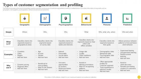 This slide showcases a framework presenting meaning, examples and purpose of customer segmentation based on multiple factors. It provides information of segments such as geographic, demographic, psychographics, behavioral, persona and predictive. Do you have to make sure that everyone on your team knows about any specific topic I yes, then you should give Types Of Customer Segmentation And Profiling Ppt PowerPoint Presentation File Background Images PDF a try. Our experts have put a lot of knowledge and effort into creating this impeccable Types Of Customer Segmentation And Profiling Ppt PowerPoint Presentation File Background Images PDF. You can use this template for your upcoming presentations, as the slides are perfect to represent even the tiniest detail. You can download these templates from the Slidegeeks website and these are easy to edit. So grab these today.