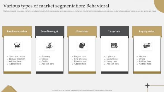 The following slide showcases market segmentation through which executives can understand consumer behaviors. It contains information about purchase occasion, benefits sought, user status, usage rate, and loyalty status. Are you searching for a IT Industry Market Research Various Types Of Market Segmentation Behavioral Background Pdf that is uncluttered, straightforward, and original It is easy to edit, and you can change the colors to suit your personal or business branding. For a presentation that expresses how much effort you have put in, this template is ideal With all of its features, including tables, diagrams, statistics, and lists, it is perfect for a business plan presentation. Make your ideas more appealing with these professional slides. Download IT Industry Market Research Various Types Of Market Segmentation Behavioral Background Pdf from Slidegeeks today. The following slide showcases market segmentation through which executives can understand consumer behaviors. It contains information about purchase occasion, benefits sought, user status, usage rate, and loyalty status.