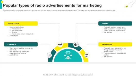 This slide shows four most popular types of radio advertisements which can be used by companies to increase their product reach. These types are live reads, sponsorships, jingles and testimonials. There are so many reasons you need a One On One Advertising Popular Types Of Radio Advertisements For Marketing Strategy SS V. The first reason is you can not spend time making everything from scratch, Thus, Slidegeeks has made presentation templates for you too. You can easily download these templates from our website easily. This slide shows four most popular types of radio advertisements which can be used by companies to increase their product reach. These types are live reads, sponsorships, jingles and testimonials.