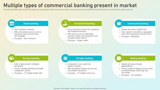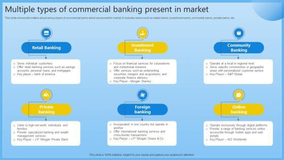 This slide shows information about various types of commercial banks which are present in market. It includes banks such as retails banks, investment banks, community banks, private banks, etc. Take your projects to the next level with our ultimate collection of Multiple Types Of Commercial Banking Present Complete Guide On Managing Banking Fin SS V. Slidegeeks has designed a range of layouts that are perfect for representing task or activity duration, keeping track of all your deadlines at a glance. Tailor these designs to your exact needs and give them a truly corporate look with your own brand colors they will make your projects stand out from the rest This slide shows information about various types of commercial banks which are present in market. It includes banks such as retails banks, investment banks, community banks, private banks, etc.