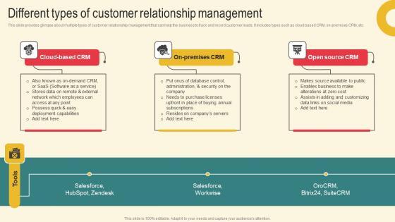 This slide provides glimpse about multiple types of customer relationship management that can help the business to track and record customer leads. It includes types such as cloud based CRM, on premises CRM, etc. Create an editable Different Types Of Customer Marketing Plan For Boosting Client Retention In Retail Banking Designs Pdf that communicates your idea and engages your audience. Whether you are presenting a business or an educational presentation, pre designed presentation templates help save time. Different Types Of Customer Marketing Plan For Boosting Client Retention In Retail Banking Designs Pdf is highly customizable and very easy to edit, covering many different styles from creative to business presentations. Slidegeeks has creative team members who have crafted amazing templates. So, go and get them without any delay. This slide provides glimpse about multiple types of customer relationship management that can help the business to track and record customer leads. It includes types such as cloud based CRM, on premises CRM, etc.