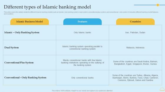This slide covers the details related to different Islamic banking models such as Islamic- only banking system, dual system, conventional plus system, and conventional only system. It includes different banking model features and countries. Make sure to capture your audiences attention in your business displays with our gratis customizable Different Types Of Islamic Banking Model Comprehensive Guide To Islamic Elements Pdf. These are great for business strategies, office conferences, capital raising or task suggestions. If you desire to acquire more customers for your tech business and ensure they stay satisfied, create your own sales presentation with these plain slides. This slide covers the details related to different Islamic banking models such as Islamic- only banking system, dual system, conventional plus system, and conventional only system. It includes different banking model features and countries.