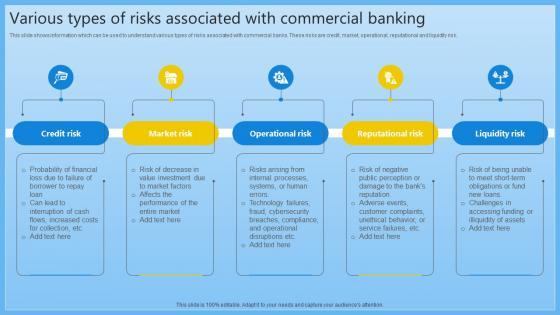 This slide shows information which can be used to understand various types of risks associated with commercial banks. These risks are credit, market, operational, reputational and liquidity risk. Take your projects to the next level with our ultimate collection of Various Types Of Risks Associated With Complete Guide On Managing Banking Fin SS V. Slidegeeks has designed a range of layouts that are perfect for representing task or activity duration, keeping track of all your deadlines at a glance. Tailor these designs to your exact needs and give them a truly corporate look with your own brand colors they will make your projects stand out from the rest This slide shows information which can be used to understand various types of risks associated with commercial banks. These risks are credit, market, operational, reputational and liquidity risk.
