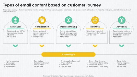 This slide showcases type of content used in email marketing campaign which helps in attracting potential customers and increase brand awareness. It includes elements such as trend reports, customer testimonials, discount offers, live demos etc. From laying roadmaps to briefing everything in detail, our templates are perfect for you. You can set the stage with your presentation slides. All you have to do is download these easy-to-edit and customizable templates. B2B Marketing Techniques Types Of Email Content Based On Customer Journey will help you deliver an outstanding performance that everyone would remember and praise you for. Do download this presentation today. This slide showcases type of content used in email marketing campaign which helps in attracting potential customers and increase brand awareness. It includes elements such as trend reports, customer testimonials, discount offers, live demos etc.