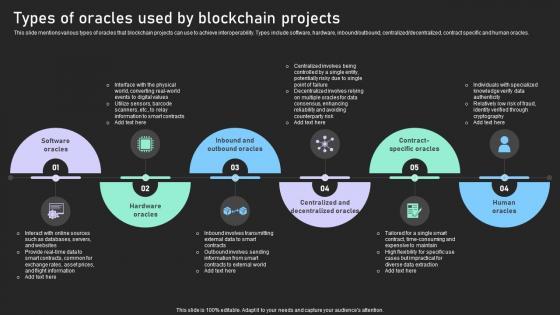 This slide mentions various types of oracles that blockchain projects can use to achieve interoperability. Types include software, hardware, inbound or outbound, centralized or decentralized, contract specific and human oracles. Are you in need of a template that can accommodate all of your creative concepts This one is crafted professionally and can be altered to fit any style. Use it with Google Slides or PowerPoint. Include striking photographs, symbols, depictions, and other visuals. Fill, move around, or remove text boxes as desired. Test out color palettes and font mixtures. Edit and save your work, or work with colleagues. Download Understanding Various Types Of Oracles Used By Blockchain Projects BCT SS V and observe how to make your presentation outstanding. Give an impeccable presentation to your group and make your presentation unforgettable. This slide mentions various types of oracles that blockchain projects can use to achieve interoperability. Types include software, hardware, inbound or outbound, centralized or decentralized, contract specific and human oracles.