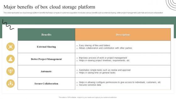 This slide represents box cloud storage platform benefits that helps company in customer acquisition. It includes various benefits such as external sharing, better project management, automate and secure collaboration. Slidegeeks is here to make your presentations a breeze with Major Benefits Of Box Cloud Storage Platform Ultimate Guide To Adopt Box Diagrams PDF With our easy-to-use and customizable templates, you can focus on delivering your ideas rather than worrying about formatting. With a variety of designs to choose from, you are sure to find one that suits your needs. And with animations and unique photos, illustrations, and fonts, you can make your presentation pop. So whether you are giving a sales pitch or presenting to the board, make sure to check out Slidegeeks first This slide represents box cloud storage platform benefits that helps company in customer acquisition. It includes various benefits such as external sharing, better project management, automate and secure collaboration.