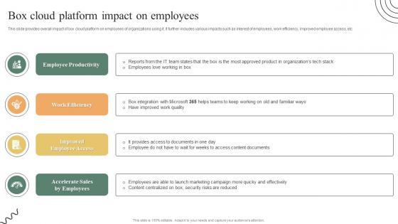 This slide provides overall impact of box cloud platform on employees of organizations using it. It further includes various impacts such as interest of employees, work efficiency, improved employee access, etc. Boost your pitch with our creative Box Cloud Platform Impact On Employees Ultimate Guide To Adopt Box Demonstration PDF. Deliver an awe-inspiring pitch that will mesmerize everyone. Using these presentation templates you will surely catch everyones attention. You can browse the ppts collection on our website. We have researchers who are experts at creating the right content for the templates. So you do not have to invest time in any additional work. Just grab the template now and use them. This slide provides overall impact of box cloud platform on employees of organizations using it. It further includes various impacts such as interest of employees, work efficiency, improved employee access, etc.