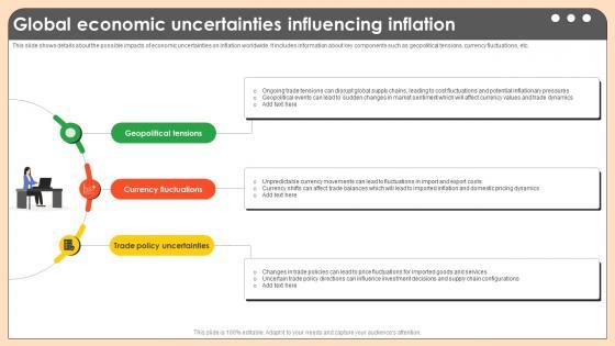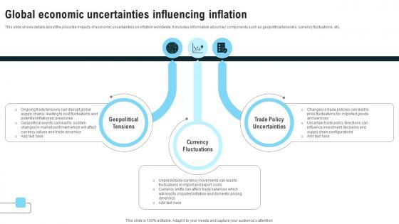 This slide shows details about the possible impacts of economic uncertainties on inflation worldwide. It includes information about key components such as geopolitical tensions, currency fluctuations, etc. Are you in need of a template that can accommodate all of your creative concepts This one is crafted professionally and can be altered to fit any style. Use it with Google Slides or PowerPoint. Include striking photographs, symbols, depictions, and other visuals. Fill, move around, or remove text boxes as desired. Test out color palettes and font mixtures. Edit and save your work, or work with colleagues. Download Global Economic Uncertainties Influencing Comprehensive Guide On Inflation Control CM SS V and observe how to make your presentation outstanding. Give an impeccable presentation to your group and make your presentation unforgettable. This slide shows details about the possible impacts of economic uncertainties on inflation worldwide. It includes information about key components such as geopolitical tensions, currency fluctuations, etc.