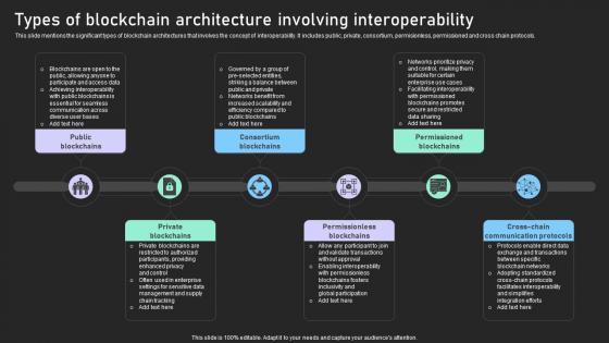 This slide mentions the significant types of blockchain architectures that involves the concept of interoperability. It includes public, private, consortium, permisionless, permissioned and cross chain protocols. Present like a pro with Understanding Various Blockchain Types Of Blockchain Architecture Involving BCT SS V. Create beautiful presentations together with your team, using our easy-to-use presentation slides. Share your ideas in real-time and make changes on the fly by downloading our templates. So whether you are in the office, on the go, or in a remote location, you can stay in sync with your team and present your ideas with confidence. With Slidegeeks presentation got a whole lot easier. Grab these presentations today. This slide mentions the significant types of blockchain architectures that involves the concept of interoperability. It includes public, private, consortium, permisionless, permissioned and cross chain protocols.