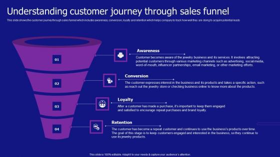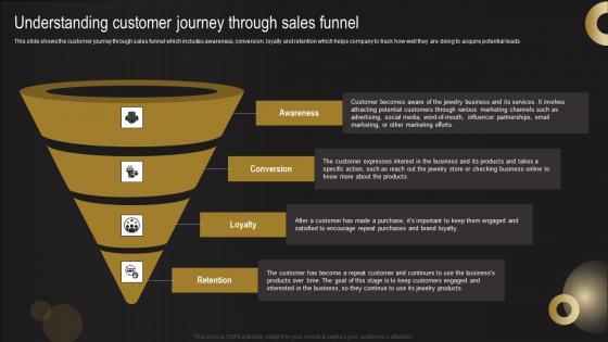 This slide shows the customer journey through sales funnel which includes awareness, conversion, loyalty and retention which helps company to track how well they are doing to acquire potential leads Do you have to make sure that everyone on your team knows about any specific topic I yes, then you should give Understanding Customer Journey Through Sales Funnel Jewelry Products Business Elements Pdf a try. Our experts have put a lot of knowledge and effort into creating this impeccable Understanding Customer Journey Through Sales Funnel Jewelry Products Business Elements Pdf You can use this template for your upcoming presentations, as the slides are perfect to represent even the tiniest detail. You can download these templates from the Slidegeeks website and these are easy to edit. So grab these today. This slide shows the customer journey through sales funnel which includes awareness, conversion, loyalty and retention which helps company to track how well they are doing to acquire potential leads