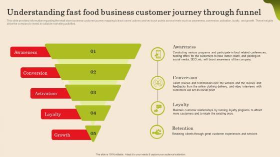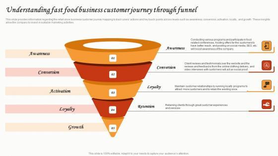This slide provides information regarding the retail store business customer journey mapping to track users actions and key touch points across levels such as awareness, conversion, activation, loyalty, and growth. These insights allow the company to invest in suitable marketing activities. Do you have to make sure that everyone on your team knows about any specific topic I yes, then you should give Understanding Fast Food Business Customer Journey Fast Food Business Plan Topics Pdf a try. Our experts have put a lot of knowledge and effort into creating this impeccable Understanding Fast Food Business Customer Journey Fast Food Business Plan Topics Pdf. You can use this template for your upcoming presentations, as the slides are perfect to represent even the tiniest detail. You can download these templates from the Slidegeeks website and these are easy to edit. So grab these today This slide provides information regarding the retail store business customer journey mapping to track users actions and key touch points across levels such as awareness, conversion, activation, loyalty, and growth. These insights allow the company to invest in suitable marketing activities.