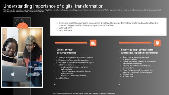 This slide provides information regarding determining importance of digital transformation that helps governmental agencies in enhancing operations or services. The key approaches include private-sector initiatives in terms of strategic management of innovation process, deployment of user-specific approaches, etc. From laying roadmaps to briefing everything in detail, our templates are perfect for you. You can set the stage with your presentation slides. All you have to do is download these easy-to-edit and customizable templates. Understanding Importance Of Digital Transformation Playbook For Managing Us Themes Pdf will help you deliver an outstanding performance that everyone would remember and praise you for. Do download this presentation today. This slide provides information regarding determining importance of digital transformation that helps governmental agencies in enhancing operations or services. The key approaches include privatesector initiatives in terms of strategic management of innovation process, deployment of userspecific approaches, etc.