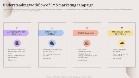 The following slide illustrates process of SMS promotion campaign to motivate customers to take actions. It includes elements such as asking audience for opt in, determining right time, drafting targeted copy, offering valuable options, segmenting audience by location, adding strong CTA etc.Find a pre-designed and impeccable Understanding Workflow Of SMS Evaluating Strengths And Weaknesses Background Pdf. The templates can ace your presentation without additional effort. You can download these easy-to-edit presentation templates to make your presentation stand out from others. So, what are you waiting for Download the template from Slidegeeks today and give a unique touch to your presentation. The following slide illustrates process of SMS promotion campaign to motivate customers to take actions. It includes elements such as asking audience for opt in, determining right time, drafting targeted copy, offering valuable options, segmenting audience by location, adding strong CTA etc.