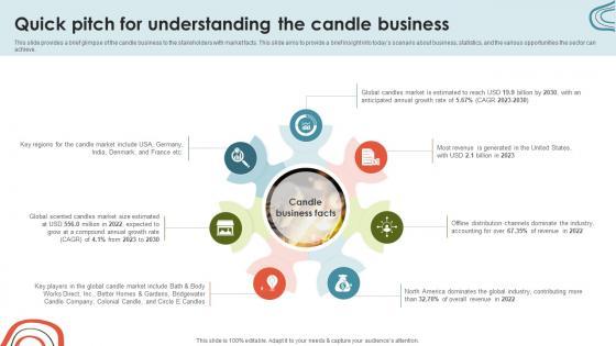 This slide provides a brief glimpse of the candle business to the stakeholders with market facts. This slide aims to provide a brief insight into todays scenario about business, statistics, and the various opportunities the sector can achieve. Presenting this PowerPoint presentation, titled Candle Business Venture Quick Pitch For Understanding The Candle Business BP SS V, with topics curated by our researchers after extensive research. This editable presentation is available for immediate download and provides attractive features when used. Download now and captivate your audience. Presenting this Candle Business Venture Quick Pitch For Understanding The Candle Business BP SS V. Our researchers have carefully researched and created these slides with all aspects taken into consideration. This is a completely customizable Candle Business Venture Quick Pitch For Understanding The Candle Business BP SS V that is available for immediate downloading. Download now and make an impact on your audience. Highlight the attractive features available with our PPTs. This slide provides a brief glimpse of the candle business to the stakeholders with market facts. This slide aims to provide a brief insight into todays scenario about business, statistics, and the various opportunities the sector can achieve.