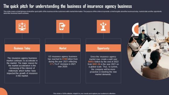 This slide covers a brief glimpse of what the quick pitch of the business to the customers with market information. The purpose of this slide is to provide a brief insights about the business today, market stats and the opportunity which the business have to achieve. Retrieve professionally designed The Quick Pitch For Understanding The Business Of Insurance Agency Assurant Insurance Agency Icons Pdf to effectively convey your message and captivate your listeners. Save time by selecting pre-made slideshows that are appropriate for various topics, from business to educational purposes. These themes come in many different styles, from creative to corporate, and all of them are easily adjustable and can be edited quickly. Access them as PowerPoint templates or as Google Slides themes. You do not have to go on a hunt for the perfect presentation because Slidegeeks got you covered from everywhere. This slide covers a brief glimpse of what the quick pitch of the business to the customers with market information. The purpose of this slide is to provide a brief insights about the business today, market stats and the opportunity which the business have to achieve.
