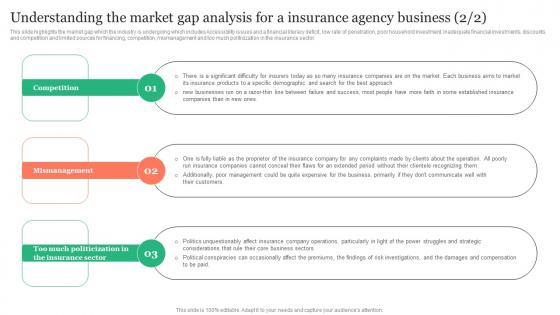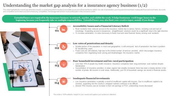 This slide highlights the market gap which the industry is undergoing which includes Accessibility issues and a financial literacy deficit, low rate of penetration, poor household investment, inadequate financial investments, discounts and competition and limited sources for financing, competition, mismanagement and too much politicization in the insurance sector. This Understanding The Market Gap Analysis For Insurance Business Plan Template Pdf from Slidegeeks makes it easy to present information on your topic with precision. It provides customization options, so you can make changes to the colors, design, graphics, or any other component to create a unique layout. It is also available for immediate download, so you can begin using it right away. Slidegeeks has done good research to ensure that you have everything you need to make your presentation stand out. Make a name out there for a brilliant performance. This slide highlights the market gap which the industry is undergoing which includes Accessibility issues and a financial literacy deficit, low rate of penetration, poor household investment, inadequate financial investments, discounts and competition and limited sources for financing, competition, mismanagement and too much politicization in the insurance sector.