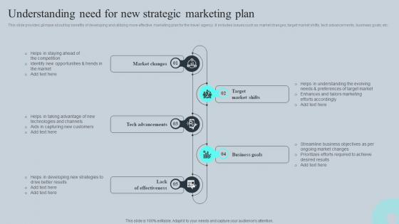 This slide provides glimpse about top benefits of developing and utilizing more effective marketing plan for the travel agency. It includes issues such as market changes, target market shifts, tech advancements, business goals, etc. Present like a pro with Tour And Travel Agency Marketing Understanding Need For New Strategic Marketing Plan Pictures PDF Create beautiful presentations together with your team, using our easy-to-use presentation slides. Share your ideas in real-time and make changes on the fly by downloading our templates. So whether you are in the office, on the go, or in a remote location, you can stay in sync with your team and present your ideas with confidence. With Slidegeeks presentation got a whole lot easier. Grab these presentations today.