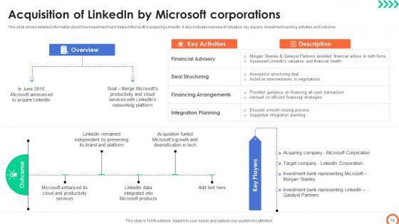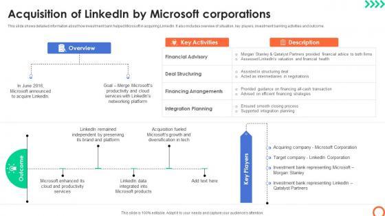 This slide shows detailed information about how investment bank helped Microsoft in acquiring LinkedIn. It also includes overview of situation, key players, investment banking activities and outcome. Find a pre-designed and impeccable Acquisition Of Linkedin By Microsoft Understanding Investment Banking Framework Fin SS V. The templates can ace your presentation without additional effort. You can download these easy-to-edit presentation templates to make your presentation stand out from others. So, what are you waiting for Download the template from Slidegeeks today and give a unique touch to your presentation. This slide shows detailed information about how investment bank helped Microsoft in acquiring LinkedIn. It also includes overview of situation, key players, investment banking activities and outcome.