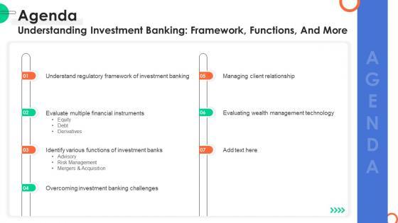 Create an editable Agenda Understanding Investment Banking Framework Functions And More Fin SS V that communicates your idea and engages your audience. Whether you are presenting a business or an educational presentation, pre-designed presentation templates help save time. Agenda Understanding Investment Banking Framework Functions And More Fin SS V is highly customizable and very easy to edit, covering many different styles from creative to business presentations. Slidegeeks has creative team members who have crafted amazing templates. So, go and get them without any delay. Our Agenda Understanding Investment Banking Framework Functions And More Fin SS V are topically designed to provide an attractive backdrop to any subject. Use them to look like a presentation pro.