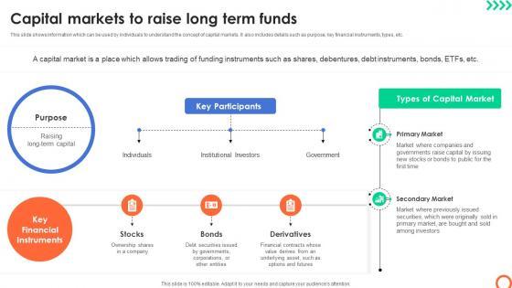 This slide shows information which can be used by individuals to understand the concept of capital markets. It also includes details such as purpose, key financial instruments, types, etc. There are so many reasons you need a Capital Markets To Raise Long Term Funds Understanding Investment Banking Framework Fin SS V. The first reason is you can not spend time making everything from scratch, Thus, Slidegeeks has made presentation templates for you too. You can easily download these templates from our website easily. This slide shows information which can be used by individuals to understand the concept of capital markets. It also includes details such as purpose, key financial instruments, types, etc.
