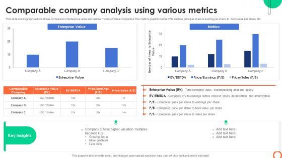 This slide shows graphs which shows comparison of enterprise value and various metrics of three companies. The metrics graph includes KPIs such as price per share to earning per share, to book value per share, etc. Get a simple yet stunning designed Comparable Company Analysis Using Various Understanding Investment Banking Framework Fin SS V. It is the best one to establish the tone in your meetings. It is an excellent way to make your presentations highly effective. So, download this PPT today from Slidegeeks and see the positive impacts. Our easy-to-edit Comparable Company Analysis Using Various Understanding Investment Banking Framework Fin SS V can be your go-to option for all upcoming conferences and meetings. So, what are you waiting for Grab this template today. This slide shows graphs which shows comparison of enterprise value and various metrics of three companies. The metrics graph includes KPIs such as price per share to earning per share, to book value per share, etc.