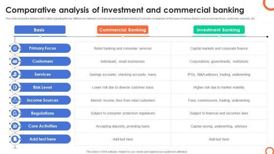 This slide shows the detailed information regrading the key differences between commercial and investment banking. It includes comparison on the basis of various factors such as primary focus, customers, services, etc. From laying roadmaps to briefing everything in detail, our templates are perfect for you. You can set the stage with your presentation slides. All you have to do is download these easy-to-edit and customizable templates. Comparative Analysis Of Investment And Commercial Understanding Investment Banking Framework Fin SS V will help you deliver an outstanding performance that everyone would remember and praise you for. Do download this presentation today. This slide shows the detailed information regrading the key differences between commercial and investment banking. It includes comparison on the basis of various factors such as primary focus, customers, services, etc.