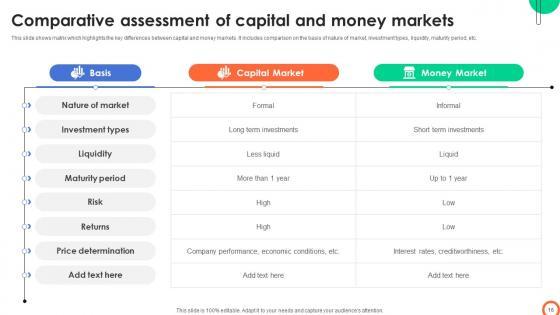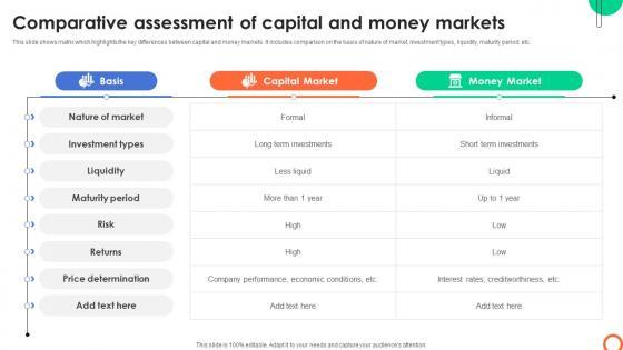 This slide shows information which can be used to understand the various components involved in private placements as a part of investment banking. It includes elements such as target audience, process, disclosure, etc. This slide shows matrix which highlights the key differences between capital and money markets. It includes comparison on the basis of nature of market, investment types, liquidity, maturity period, etc. Slidegeeks is here to make your presentations a breeze with Comparative Assessment Of Capital And Money Understanding Investment Banking Framework Fin SS V With our easy-to-use and customizable templates, you can focus on delivering your ideas rather than worrying about formatting. With a variety of designs to choose from, you are sure to find one that suits your needs. And with animations and unique photos, illustrations, and fonts, you can make your presentation pop. So whether you are giving a sales pitch or presenting to the board, make sure to check out Slidegeeks first This slide shows matrix which highlights the key differences between capital and money markets. It includes comparison on the basis of nature of market, investment types, liquidity, maturity period, etc.