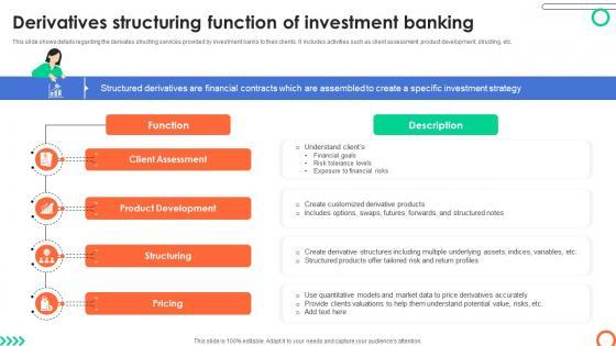 This slide shows details regarding the derivates structing services provided by investment banks to their clients. It includes activities such as client assessment, product development, structing, etc. Are you in need of a template that can accommodate all of your creative concepts This one is crafted professionally and can be altered to fit any style. Use it with Google Slides or PowerPoint. Include striking photographs, symbols, depictions, and other visuals. Fill, move around, or remove text boxes as desired. Test out color palettes and font mixtures. Edit and save your work, or work with colleagues. Download Derivatives Structuring Function Of Investment Understanding Investment Banking Framework Fin SS V and observe how to make your presentation outstanding. Give an impeccable presentation to your group and make your presentation unforgettable. This slide shows details regarding the derivates structing services provided by investment banks to their clients. It includes activities such as client assessment, product development, structing, etc.
