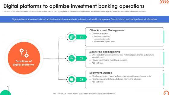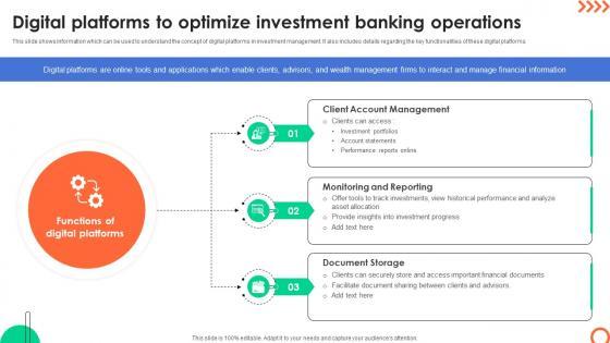 This slide shows information which can be used to understand the concept of digital platforms in investment management. It also includes details regarding the key functionalities of these digital platforms. Crafting an eye-catching presentation has never been more straightforward. Let your presentation shine with this tasteful yet straightforward Digital Platforms To Optimize Investment Understanding Investment Banking Framework Fin SS V template. It offers a minimalistic and classy look that is great for making a statement. The colors have been employed intelligently to add a bit of playfulness while still remaining professional. Construct the ideal Digital Platforms To Optimize Investment Understanding Investment Banking Framework Fin SS V that effortlessly grabs the attention of your audience Begin now and be certain to wow your customers This slide shows information which can be used to understand the concept of digital platforms in investment management. It also includes details regarding the key functionalities of these digital platforms.