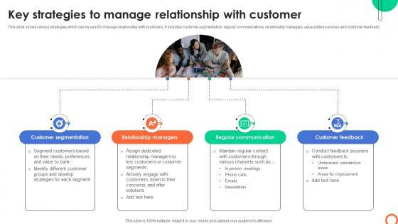 This slide shows various strategies which can be used to manage relationship with customers. It includes customer segmentation, regular communications, relationship managers, value added services and customer feedback. Presenting this PowerPoint presentation, titled Key Strategies To Manage Relationship With Customer Understanding Investment Banking Framework Fin SS V, with topics curated by our researchers after extensive research. This editable presentation is available for immediate download and provides attractive features when used. Download now and captivate your audience. Presenting this Key Strategies To Manage Relationship With Customer Understanding Investment Banking Framework Fin SS V. Our researchers have carefully researched and created these slides with all aspects taken into consideration. This is a completely customizable Key Strategies To Manage Relationship With Customer Understanding Investment Banking Framework Fin SS V that is available for immediate downloading. Download now and make an impact on your audience. Highlight the attractive features available with our PPTs. This slide shows various strategies which can be used to manage relationship with customers. It includes customer segmentation, regular communications, relationship managers, value added services and customer feedback.
