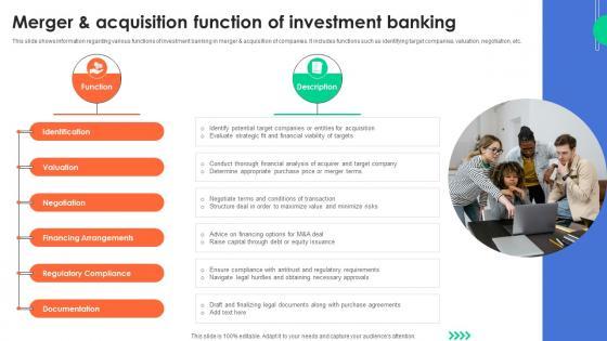 This slide shows information regarding various functions of investment banking in merger and acquisition of companies. It includes functions such as identifying target companies, valuation, negotiation, etc. This Merger And Acquisition Function Of Investment Understanding Investment Banking Framework Fin SS V from Slidegeeks makes it easy to present information on your topic with precision. It provides customization options, so you can make changes to the colors, design, graphics, or any other component to create a unique layout. It is also available for immediate download, so you can begin using it right away. Slidegeeks has done good research to ensure that you have everything you need to make your presentation stand out. Make a name out there for a brilliant performance. This slide shows information regarding various functions of investment banking in merger and acquisition of companies. It includes functions such as identifying target companies, valuation, negotiation, etc.
