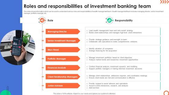 This slide shows information which can be used to understand various roles and responsibilities of wealth management team. Wealth management team includes managing director, senior investment manager, portfolio manager, etc. Slidegeeks has constructed Roles And Responsibilities Of Investment Banking Understanding Investment Banking Framework Fin SS V after conducting extensive research and examination. These presentation templates are constantly being generated and modified based on user preferences and critiques from editors. Here, you will find the most attractive templates for a range of purposes while taking into account ratings and remarks from users regarding the content. This is an excellent jumping-off point to explore our content and will give new users an insight into our top-notch PowerPoint Templates. This slide shows information which can be used to understand various roles and responsibilities of wealth management team. Wealth management team includes managing director, senior investment manager, portfolio manager, etc.