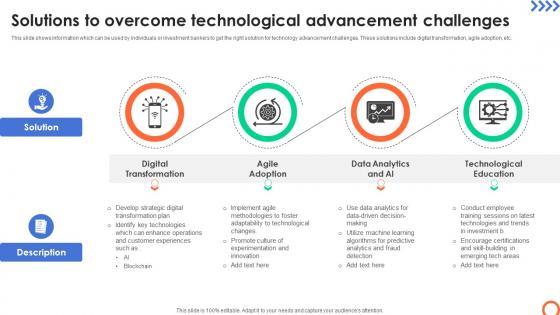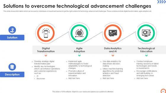 This slide shows information which can be used by individuals or investment bankers to get the right solution for technology advancement challenges. These solutions include digital transformation, agile adoption, etc. This Solutions To Overcome Technological Advancement Understanding Investment Banking Framework Fin SS V from Slidegeeks makes it easy to present information on your topic with precision. It provides customization options, so you can make changes to the colors, design, graphics, or any other component to create a unique layout. It is also available for immediate download, so you can begin using it right away. Slidegeeks has done good research to ensure that you have everything you need to make your presentation stand out. Make a name out there for a brilliant performance. This slide shows information which can be used by individuals or investment bankers to get the right solution for technology advancement challenges. These solutions include digital transformation, agile adoption, etc.