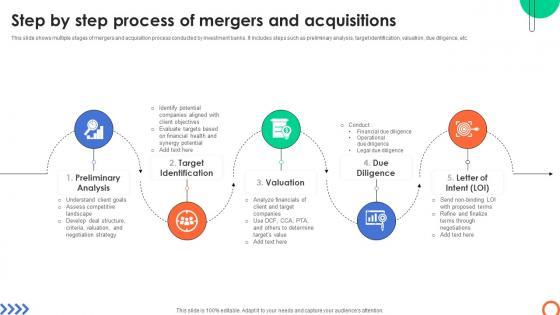 This slide shows multiple stages of mergers and acquisition process conducted by investment banks. It includes steps such as preliminary analysis, target identification, valuation, due diligence, etc. Take your projects to the next level with our ultimate collection of Step By Step Process Of Mergers And Acquisitions Understanding Investment Banking Framework Fin SS V. Slidegeeks has designed a range of layouts that are perfect for representing task or activity duration, keeping track of all your deadlines at a glance. Tailor these designs to your exact needs and give them a truly corporate look with your own brand colors they will make your projects stand out from the rest This slide shows multiple stages of mergers and acquisition process conducted by investment banks. It includes steps such as preliminary analysis, target identification, valuation, due diligence, etc.