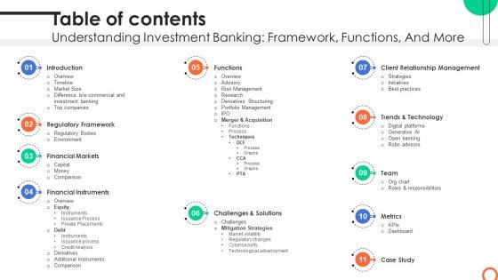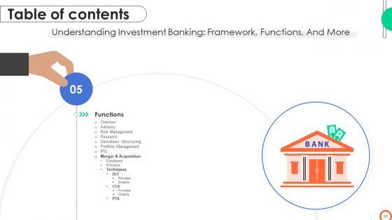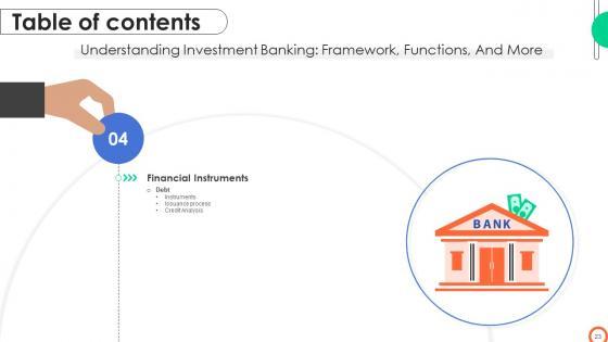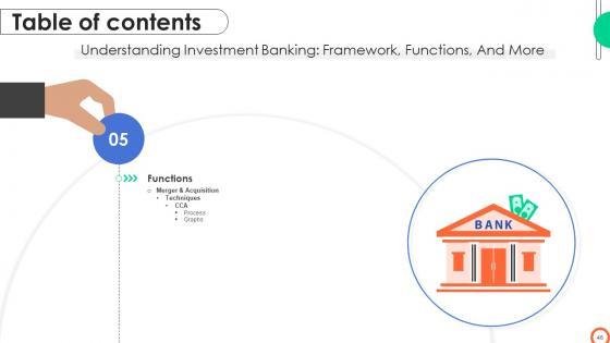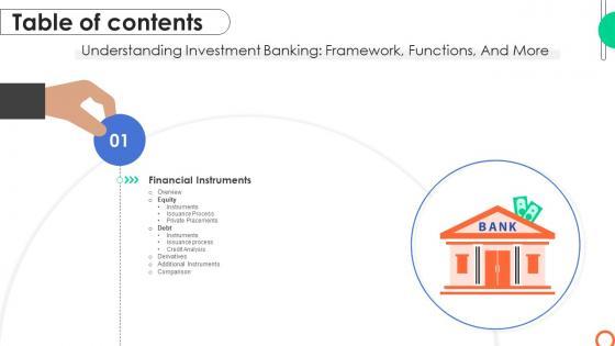 This Table Of Contents Understanding Investment Banking Framework Functions And More Fin SS V is perfect for any presentation, be it in front of clients or colleagues. It is a versatile and stylish solution for organizing your meetings. The Table Of Contents Understanding Investment Banking Framework Functions And More Fin SS V features a modern design for your presentation meetings. The adjustable and customizable slides provide unlimited possibilities for acing up your presentation. Slidegeeks has done all the homework before launching the product for you. So, do not wait, grab the presentation templates today Our Table Of Contents Understanding Investment Banking Framework Functions And More Fin SS V are topically designed to provide an attractive backdrop to any subject. Use them to look like a presentation pro.