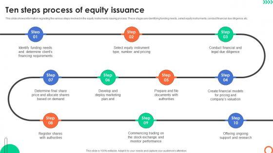 This slide shows information regrading the various steps involved in the equity instruments issuing process. These stages are identifying funding needs, select equity instruments, conduct financial due diligence, etc. Welcome to our selection of the Ten Steps Process Of Equity Issuance Understanding Investment Banking Framework Fin SS V. These are designed to help you showcase your creativity and bring your sphere to life. Planning and Innovation are essential for any business that is just starting out. This collection contains the designs that you need for your everyday presentations. All of our PowerPoints are 100Percent editable, so you can customize them to suit your needs. This multi-purpose template can be used in various situations. Grab these presentation templates today. This slide shows information regrading the various steps involved in the equity instruments issuing process. These stages are identifying funding needs, select equity instruments, conduct financial due diligence, etc.
