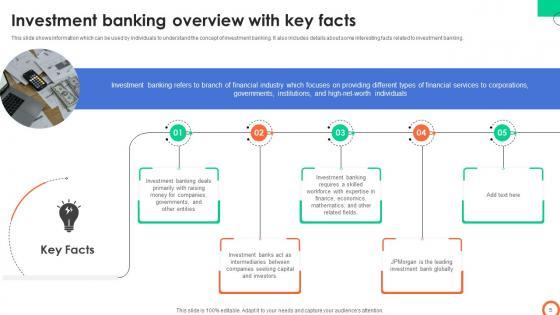 This slide shows information which can be used by individuals to understand the concept of investment banking. It also includes details about some interesting facts related to investment banking. The best PPT templates are a great way to save time, energy, and resources. Slidegeeks have 100 percent editable powerpoint slides making them incredibly versatile. With these quality presentation templates, you can create a captivating and memorable presentation by combining visually appealing slides and effectively communicating your message. Download Investment Banking Overview With Key Facts Understanding Investment Banking Framework Fin SS V from Slidegeeks and deliver a wonderful presentation. This slide shows information which can be used by individuals to understand the concept of investment banking. It also includes details about some interesting facts related to investment banking.