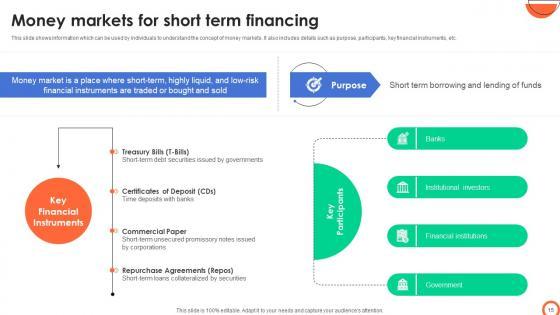 This slide shows information which can be used by individuals to understand the concept of money markets. It also includes details such as purpose, participants, key financial instruments, etc. Take your projects to the next level with our ultimate collection of Money Markets For Short Term Financing Understanding Investment Banking Framework Fin SS V. Slidegeeks has designed a range of layouts that are perfect for representing task or activity duration, keeping track of all your deadlines at a glance. Tailor these designs to your exact needs and give them a truly corporate look with your own brand colors they will make your projects stand out from the rest This slide shows information which can be used by individuals to understand the concept of money markets. It also includes details such as purpose, participants, key financial instruments, etc.