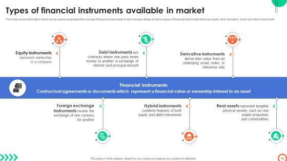 This slide shows information which can be used to understand the concept of financial instruments. It also includes details of various types of financial instruments which are equity, debt, derivative, hybrid and other instruments. The best PPT templates are a great way to save time, energy, and resources. Slidegeeks have 100 percent editable powerpoint slides making them incredibly versatile. With these quality presentation templates, you can create a captivating and memorable presentation by combining visually appealing slides and effectively communicating your message. Download Types Of Financial Instruments Available In Understanding Investment Banking Framework Fin SS V from Slidegeeks and deliver a wonderful presentation. This slide shows information which can be used to understand the concept of financial instruments. It also includes details of various types of financial instruments which are equity, debt, derivative, hybrid and other instruments