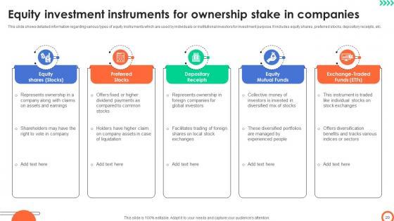 This slide shows detailed information regarding various types of equity instruments which are used by individuals or institutional investors for investment purpose. It includes equity shares, preferred stocks, depository receipts, etc. Formulating a presentation can take up a lot of effort and time, so the content and message should always be the primary focus. The visuals of the PowerPoint can enhance the presenters message, so our Equity Investment Instruments For Ownership Understanding Investment Banking Framework Fin SS V was created to help save time. Instead of worrying about the design, the presenter can concentrate on the message while our designers work on creating the ideal templates for whatever situation is needed. Slidegeeks has experts for everything from amazing designs to valuable content, we have put everything into Equity Investment Instruments For Ownership Understanding Investment Banking Framework Fin SS V This slide shows detailed information regarding various types of equity instruments which are used by individuals or institutional investors for investment purpose. It includes equity shares, preferred stocks, depository receipts, etc.