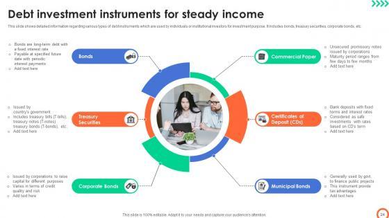 This slide shows detailed information regarding various types of debt instruments which are used by individuals or institutional investors for investment purpose. It includes bonds, treasury securities, corporate bonds, etc. If your project calls for a presentation, then Slidegeeks is your go-to partner because we have professionally designed, easy-to-edit templates that are perfect for any presentation. After downloading, you can easily edit Debt Investment Instruments For Steady Understanding Investment Banking Framework Fin SS V and make the changes accordingly. You can rearrange slides or fill them with different images. Check out all the handy templates This slide shows detailed information regarding various types of debt instruments which are used by individuals or institutional investors for investment purpose. It includes bonds, treasury securities, corporate bonds, etc.