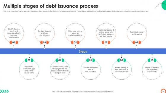 This slide shows information regrading the various steps involved in the debt instruments issuing process. These stages are identifying funding needs, select debt instruments, conduct financial due diligence, etc. This Multiple Stages Of Debt Issuance Process Understanding Investment Banking Framework Fin SS V is perfect for any presentation, be it in front of clients or colleagues. It is a versatile and stylish solution for organizing your meetings. The Multiple Stages Of Debt Issuance Process Understanding Investment Banking Framework Fin SS V features a modern design for your presentation meetings. The adjustable and customizable slides provide unlimited possibilities for acing up your presentation. Slidegeeks has done all the homework before launching the product for you. So, do not wait, grab the presentation templates today This slide shows information regrading the various steps involved in the debt instruments issuing process. These stages are identifying funding needs, select debt instruments, conduct financial due diligence, etc.
