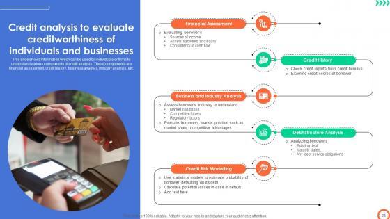 This slide shows information which can be used by individuals or firms to understand various components of credit analysis. These components are financial assessment, credit history, business analysis, industry analysis, etc. Whether you have daily or monthly meetings, a brilliant presentation is necessary. Credit Analysis To Evaluate Creditworthiness Of Understanding Investment Banking Framework Fin SS V can be your best option for delivering a presentation. Represent everything in detail using Credit Analysis To Evaluate Creditworthiness Of Understanding Investment Banking Framework Fin SS V and make yourself stand out in meetings. The template is versatile and follows a structure that will cater to your requirements. All the templates prepared by Slidegeeks are easy to download and edit. Our research experts have taken care of the corporate themes as well. So, give it a try and see the results. This slide shows information which can be used by individuals or firms to understand various components of credit analysis. These components are financial assessment, credit history, business analysis, industry analysis, etc.